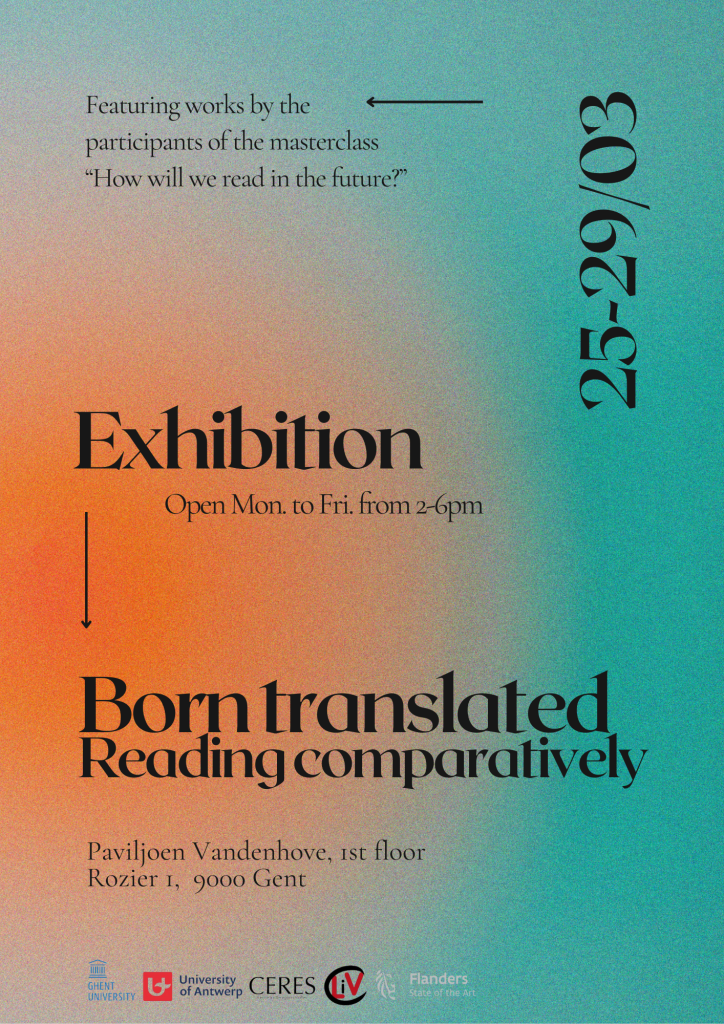 There will also be a companion exhibition titled Born translated. Reading comparatively, which will be open to the public from the 25th until the 29th of March, Monday to Friday, from 14.00pm to 18.00pm. The COLLAB team will showcase two pieces: a video installation made by Anna Sofia Churchill and Joana Roqué Pesquer, as well as a zine made by Marialena Avgerinou.